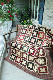 This morning I got up and jumped right in with it and finished a binding I had started last week while I watched the movie “Whip It.” It was an okay movie that didn’t require a lot of focus to follow along–just the thing to watch while sewing. This quilt is “Crossed Rails.” Basically you make rail fence blocks, cut them in half on the diagonal and sew them back together. I sewed it together with sashing and cornerstones and really like how it turned out. It was made completely from stash. Here is a picture of the finished quilt.